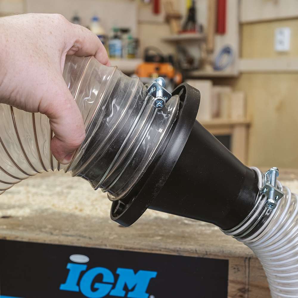 IGM Quick Hose Connector brukes som en reduksjon for slanger med diameter på 63 mm og 100 mm, og gjør det enkelt å raskt bytte mellom maskinen og avsugeren. Koblingen består av to reduksjonsdeler. Den ene delen (100 mm) er utstyrt med 8 magneter, som fester den andre delen (63 mm) med en magnetisert ring. Leveres med to slangeklemmer (63 mm og 100 mm) for permanent festing til slange.