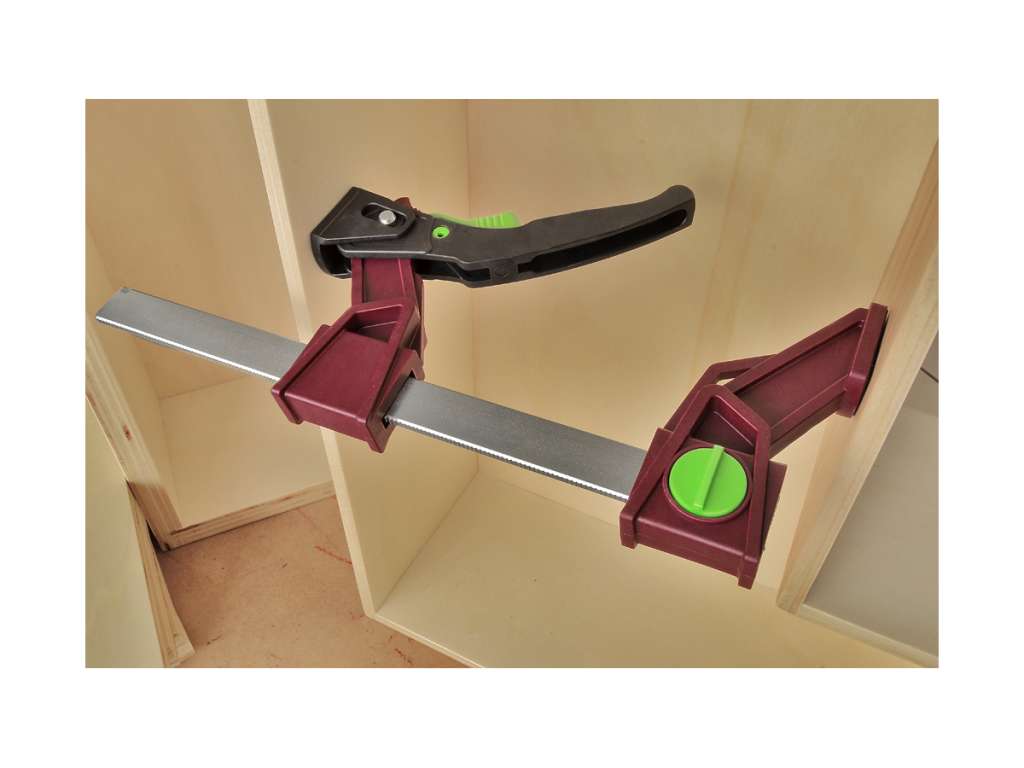 Tvinge med hurtigspak for tilspenning. Skinne 20×5 mm, Spennkjefter av glassfiber. Presskraft 120 kg