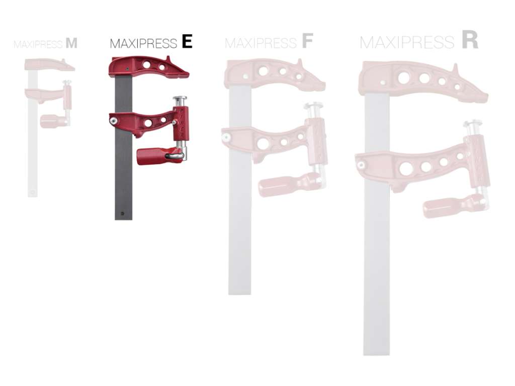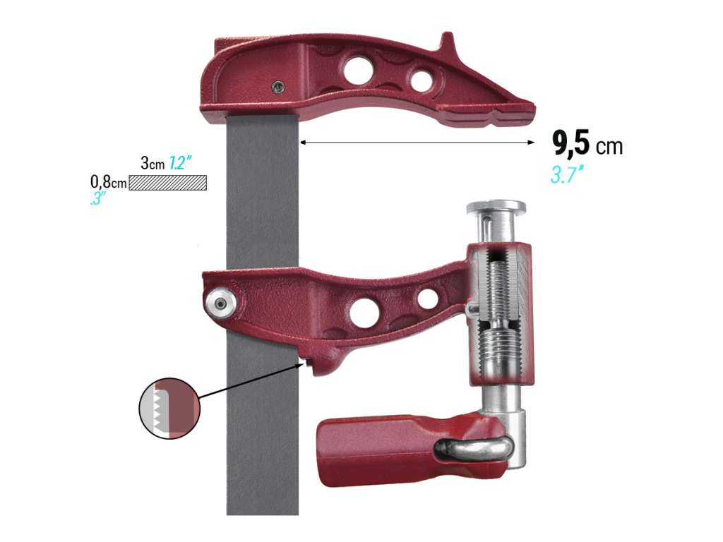 Kraftig skrutvinge med støpte kjefter og skinne 30×8 mm, utladning 9,5 cm. Maxi tvingene har leddet håndtak og dobbelvirkende skrue som gjør strammingen raskere og med større kraft. Presskraft 850 kg