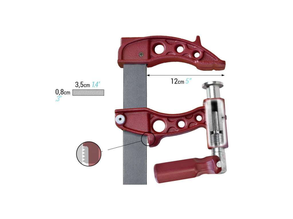 Kraftig skrutvinge med støpte kjefter og skinne 35×8 mm, utladning 12 cm. Maxi tvingene har leddet håndtak og dobbelvirkende skrue som gjør strammingen raskere og med større kraft. Presskraft 900 kg