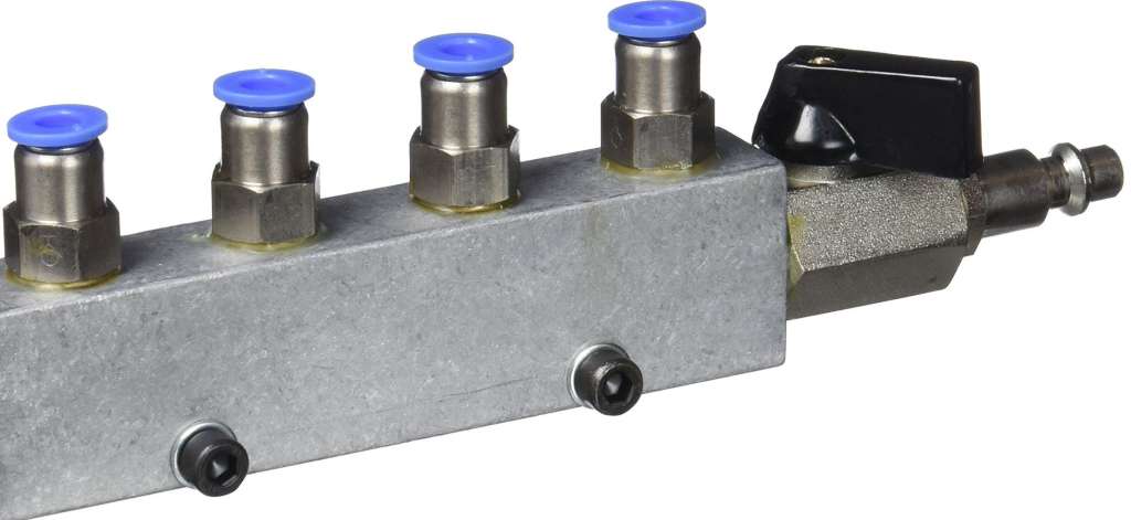 Fordeleren har stengeventil for å ta av trykket for å løse fastspenningen av emnet