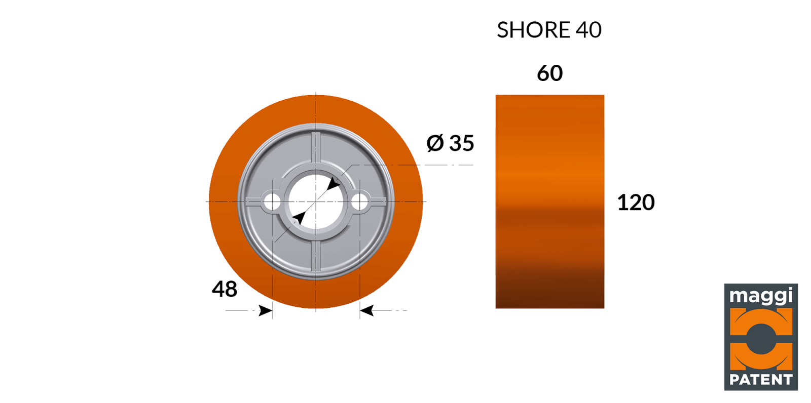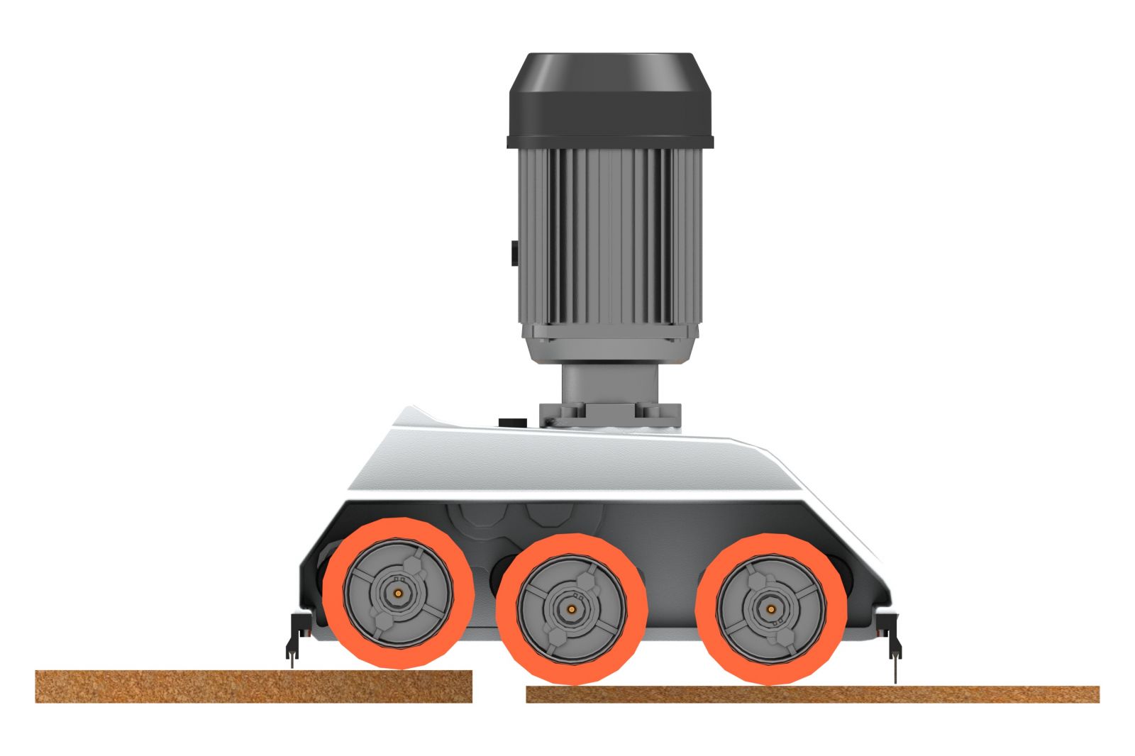 Kraftige gummivalser 120×60 mm med uavhengig fjæring på 20 mm, produsert i spesialgummi som griper godt på de fleste typer materialer.