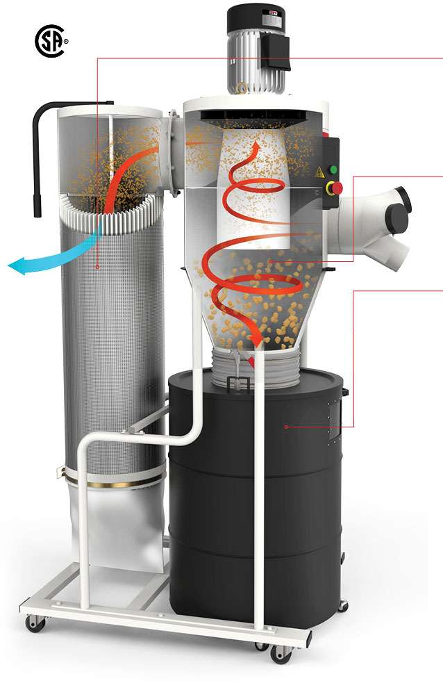 gjennom syklon og direktedrevet vifte. Filterpatron sikrer filtrering av de