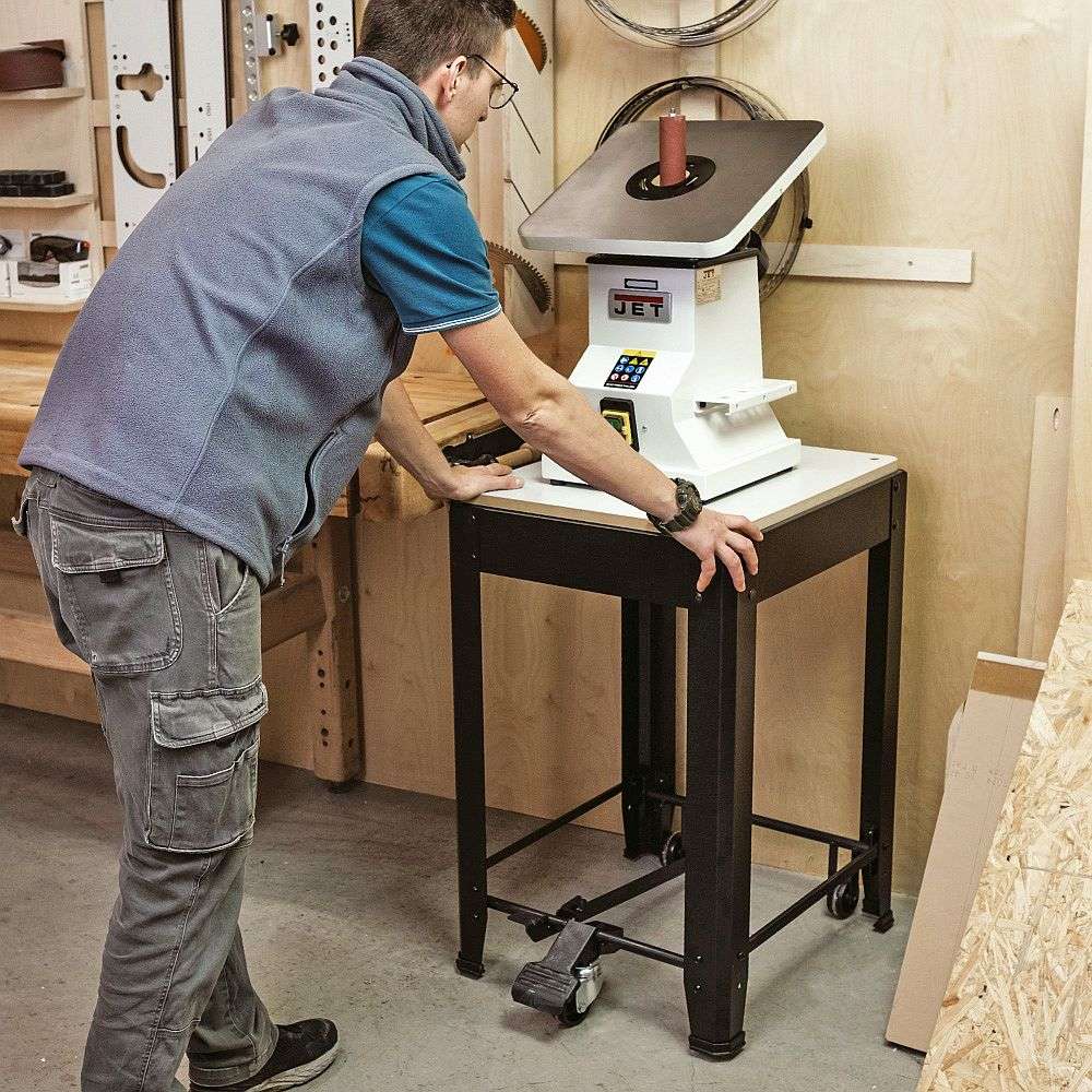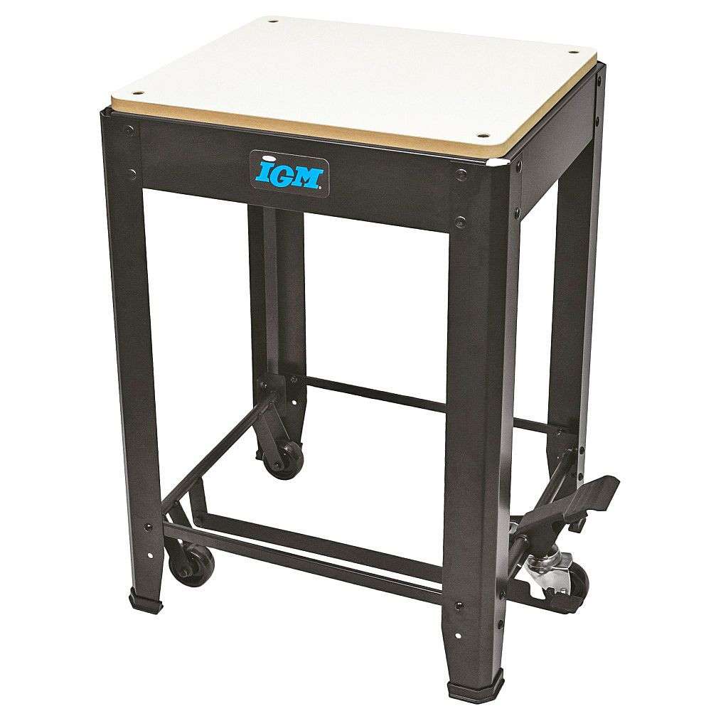 løfter bordet opp på hjul og senker den ned til gulvet. Ideell for freser,