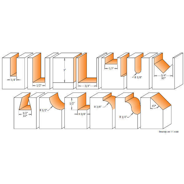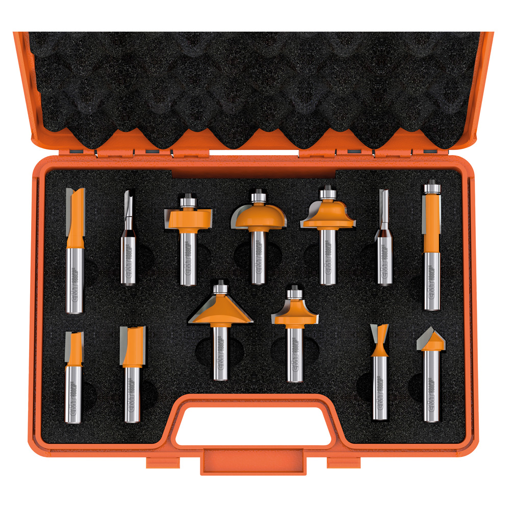 CMT’s 13 most frequently used 12.7mm shank router bits assembled in a compact and attractive hardwood case for your convenience! The bits are made with the finest steel and carbide