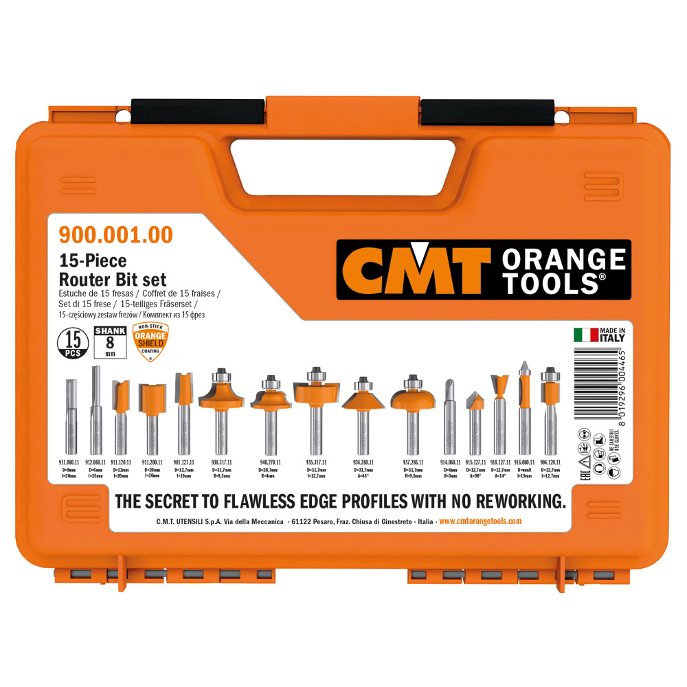 Fresesett med 15 stk. HM freser i beste CMT kvalitet. Settet inneholder et stort utvalg rette freser for notfresing og kantfresing, hulkilfreser, kantfreser for avrunding og profilering, falsfresing m.m. Kommer i koffert med frest skum