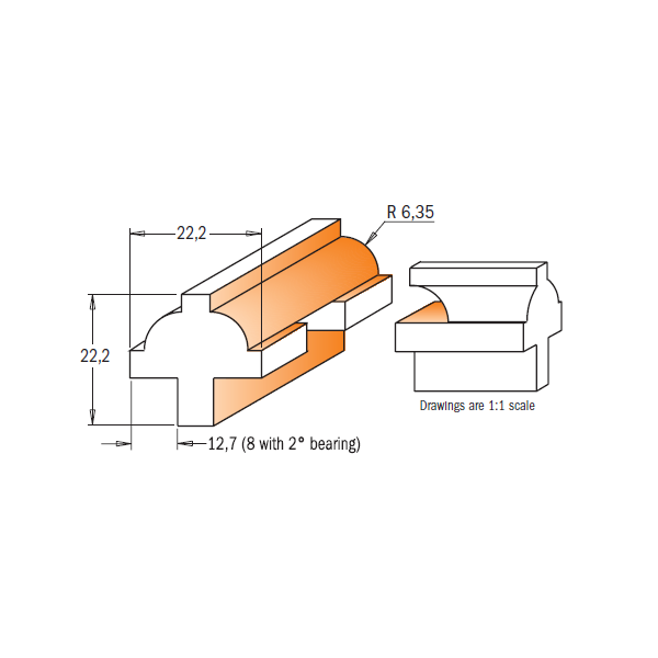 Fresesett bestående av 3 stk. freser for fremstilling av sprosser til skapdører o.l. Settet består av en HM profilfres til profilering av sprosselisten, en HM kontraprofilfres til kontraprofilfresing av endene på sprosselisten, samt en HM falsfres til å frese glassfalsen. Alle fresene har kulelager slik at en også kan frese buede rammer. Kontraprofilfresens unike design gir deg mulighet til å frese lange tapper for gjennomgående tapping for autentisk og håndverksmessig perfekt sammenføyning. Settet er beregnet for 22,2 mm brede lister, og leveres med 8 eller 12,7 mm skaftdiameter.