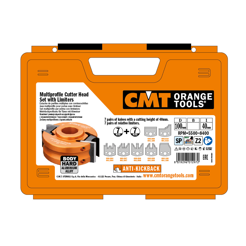 Fresesett i platkoffert med 7 profiler for ramtreprofiler til skapdører og vanlige dører.