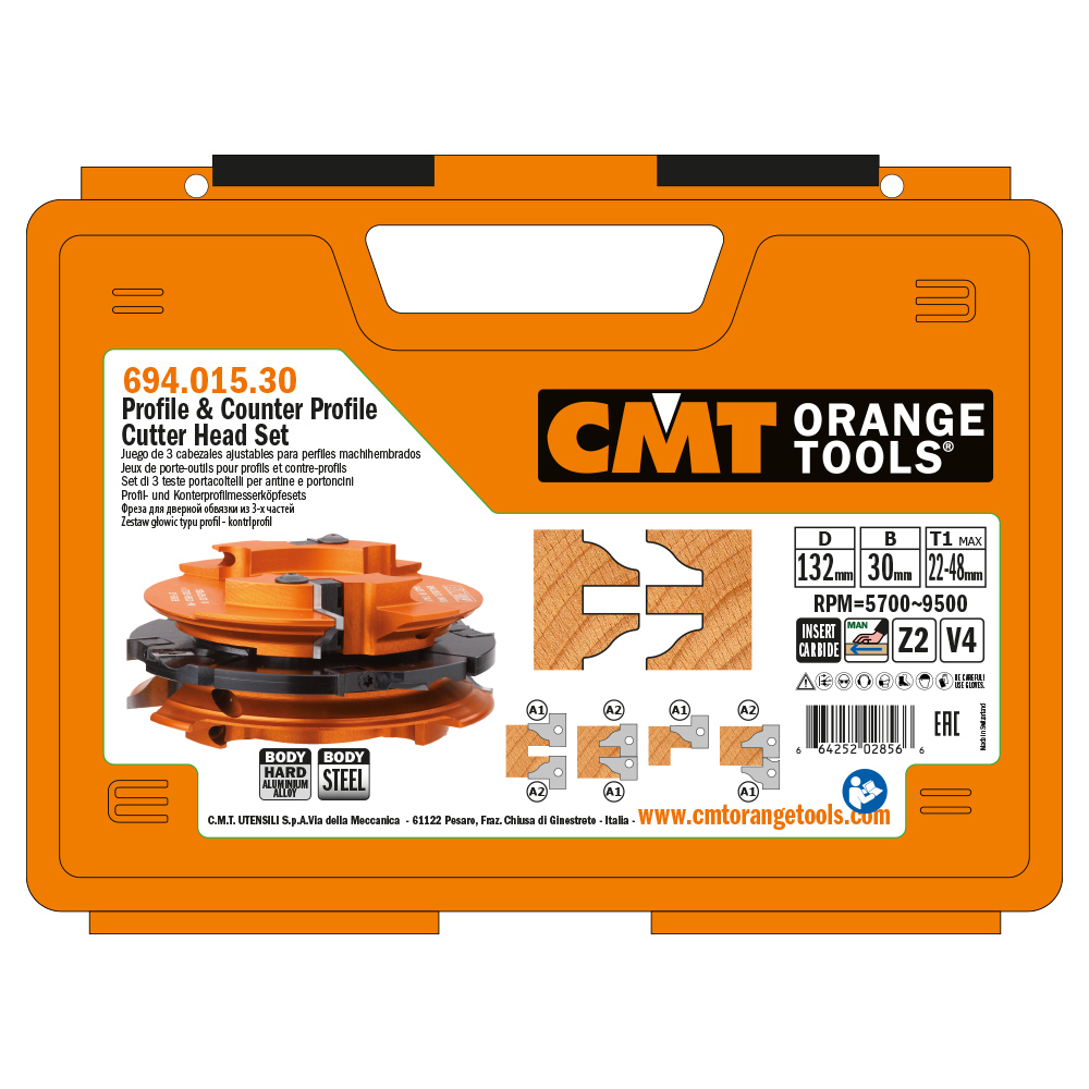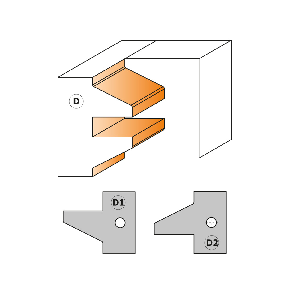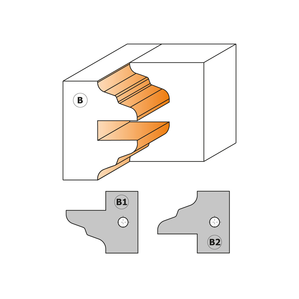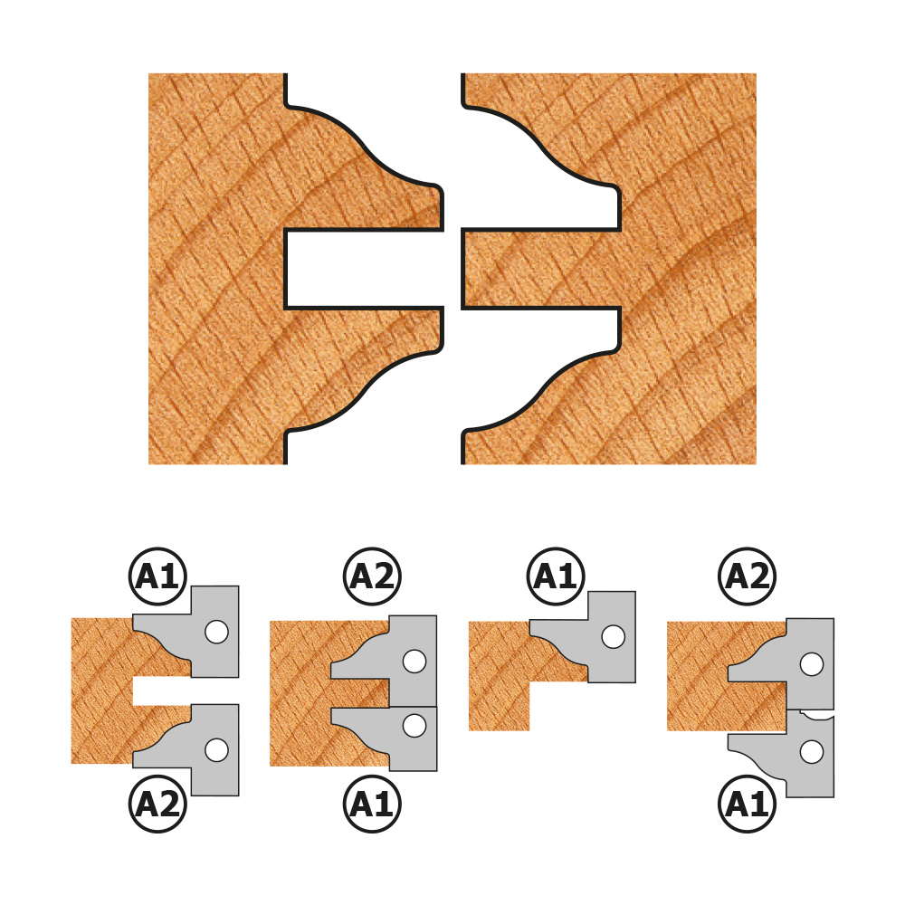 Kuttersett for ramtre for dører med dobbelsidig profil og kontraprofil.
