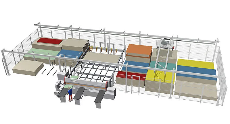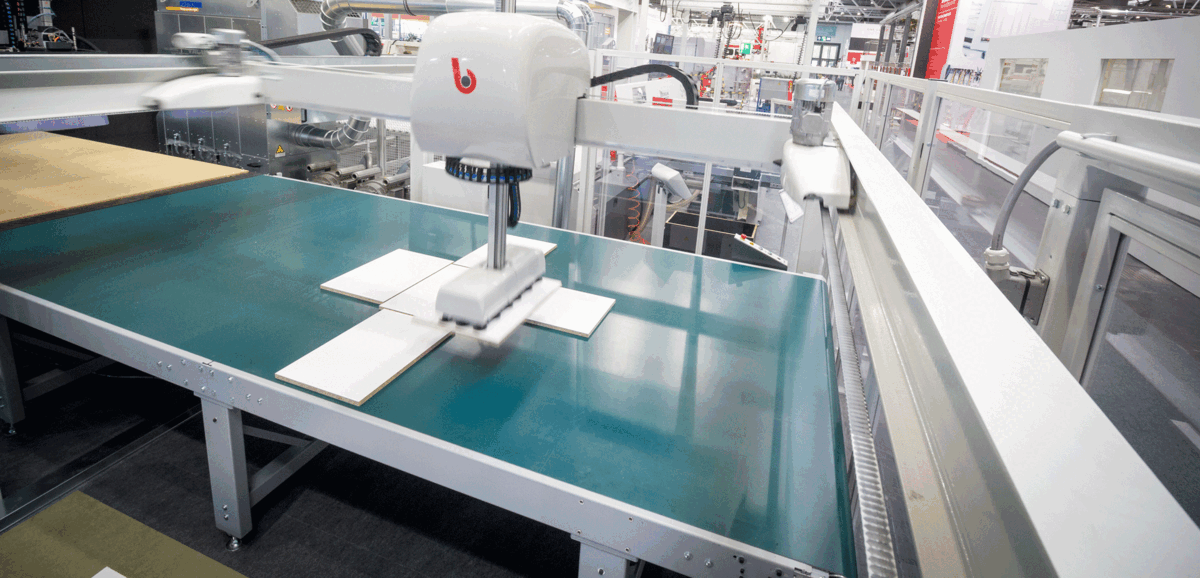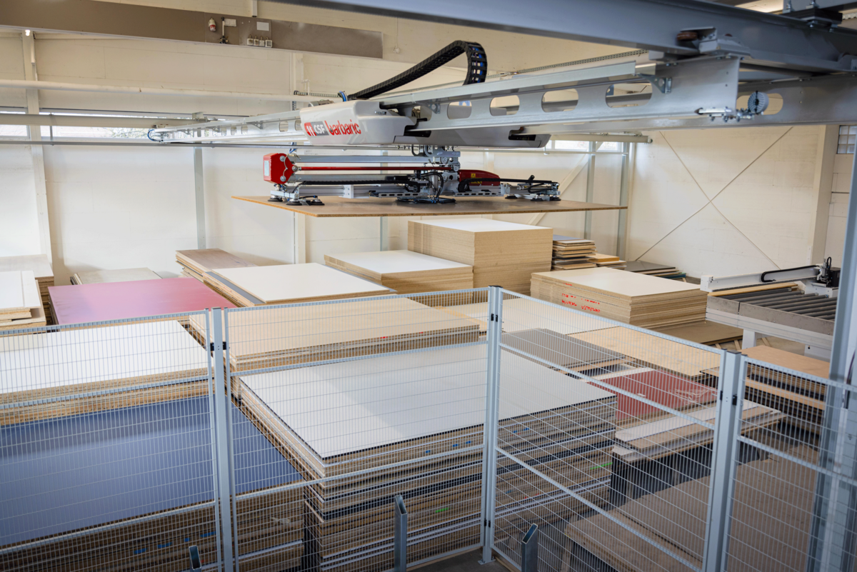 CSF-lageret benytter intelligente griper- og vakuumsystemer som løfter platene kontrollert enkeltvis, helt uten risiko for skade eller brekkasje. Med helautomatisk inn- og utmating, dynamisk jobbstyring og integrert lagerkontroll sikres en optimal og kontinuerlig flyt i produksjonen – uten manuelle løft og med betydelig redusert arealbehov.