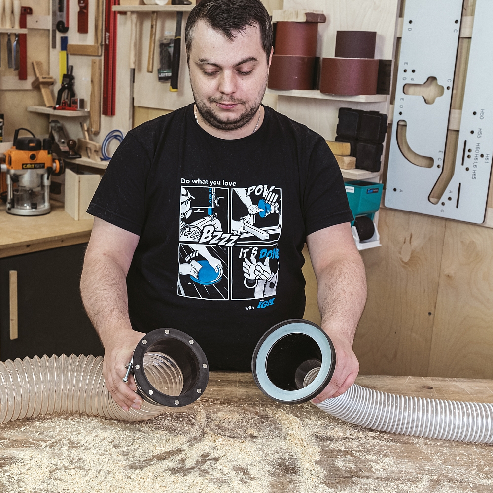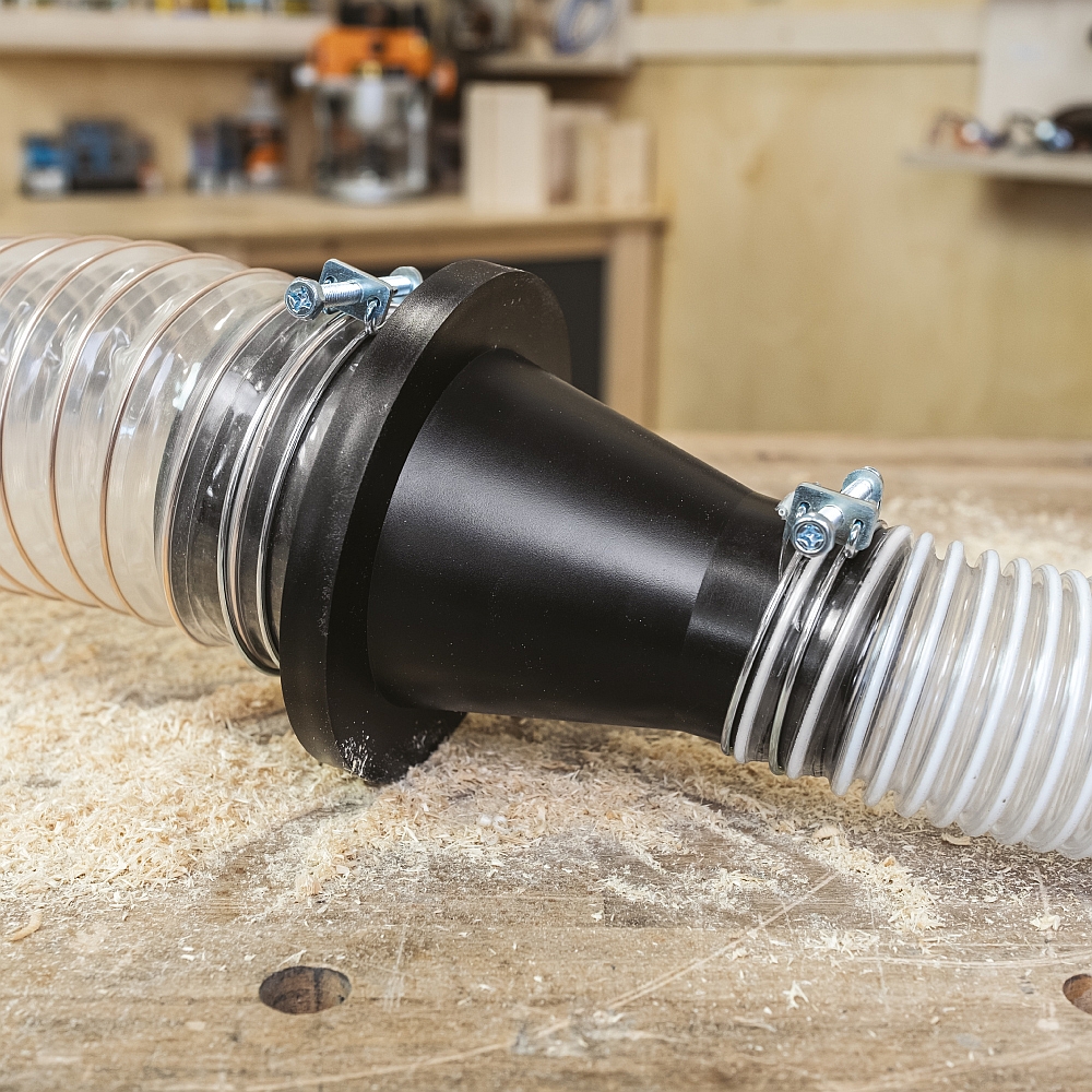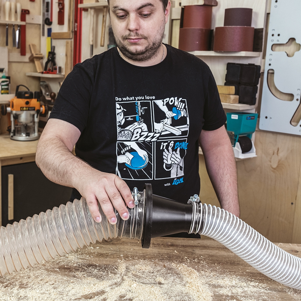 IGM Quick Hose Connector brukes som en reduksjon for slanger med diameter på 63 mm og 100 mm, og gjør det enkelt å raskt bytte mellom maskinen og avsugeren. Koblingen består av to reduksjonsdeler. Den ene delen (100 mm) er utstyrt med 8 magneter, som fester den andre delen (63 mm) med en magnetisert ring. Leveres med to slangeklemmer (63 mm og 100 mm) for permanent festing til slange.